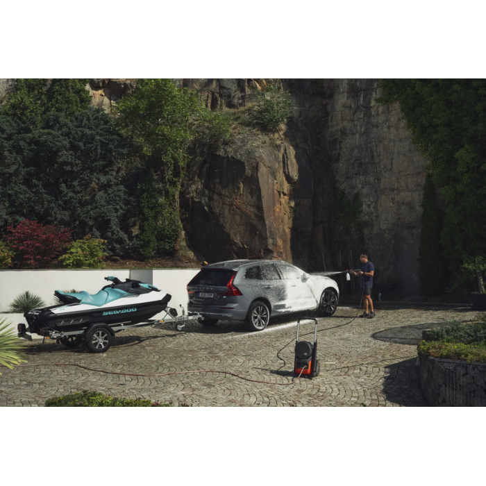 Довгий шланг (9 м) дає змогу працювати на великій відстані від джерела води, збільшуючи радіус дії та зручність використання. Довгий електричний шнур (5 м) забезпечує підключення мийки на значній відстані від розетки, підвищуючи мобільність.