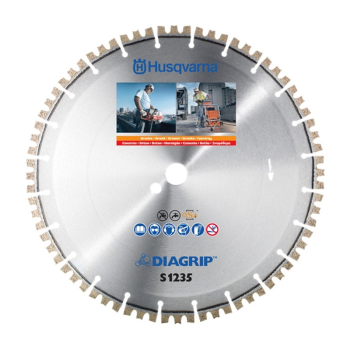 Діамантовий диск Husqvarna S 1235, 350-25 ,4 - призначений для високопродуктивного різання бетону, граніту, мармуру, залізобетону. Ріжучі диски Husqvarna S 1245 Diagrip – це нова серія ріжучих дисків класу преміум з унікальною технологією виготовлення сегментів Diagrip™, що забезпечує високу продуктивність, тривалий термін служби та швидке чисте різання навіть по сильно армованому бетону. Призначені дані диски для професійного застосування з високими показниками.