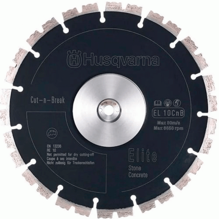 Алмазний диск HUSQVARNA EL10CNB 09"/230 пара по бетону складається з двох предметів (два диски), призначений для роботи на швонарізниках і бензорізах. Диск алмазний розміром 230 мм ідеально підходить для мокрого різання бетону, залізобетону та мармуру. Диск має високу продуктивність і великий ресурс роботи. Алмазні сегменти висотою 10,5 мм гарантують чудову швидкість різання характеристики та довгий термін служби. Відмінні характеристики дозволяють користувачеві виконувати свою роботу точно і швидко. Диск алмазний HUSQVARNA EL10CNB 09"/230 відноситься до типу сегментних дисків. Максимальна швидкість обертів становить 6850 об/хв.